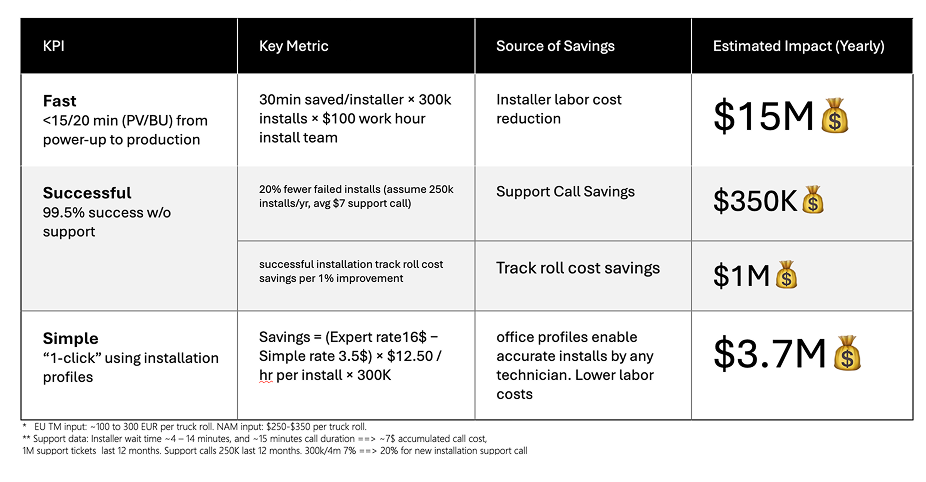 Financial: Calculated (Minutes Saved $\times$ Installer Rate $\times$ 300k sites) to show $M industry savings.